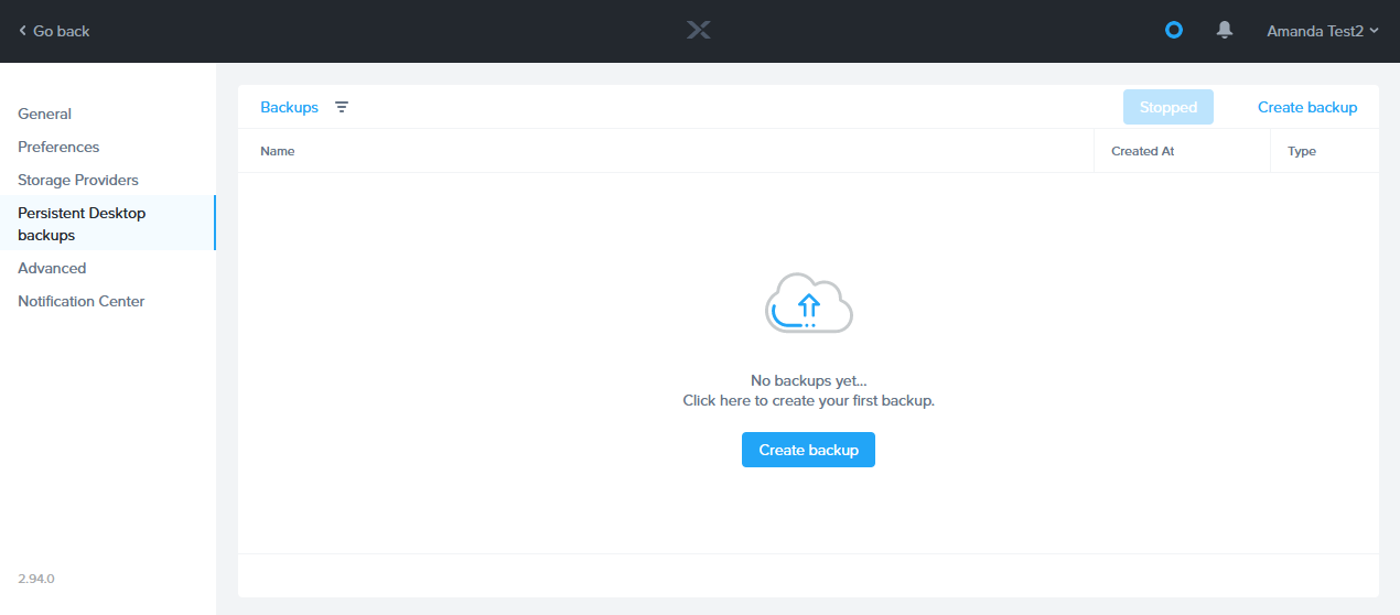 If your administrator has enabled the ability for you to manage your own persistent desktop backups, you will see the “Persistent Desktop backups” page in your profile. On this page, you will see any backups created by your account administrator, as well as any backups you have created. From this page, you can filter your backups by name, creation date/time, and backup type.