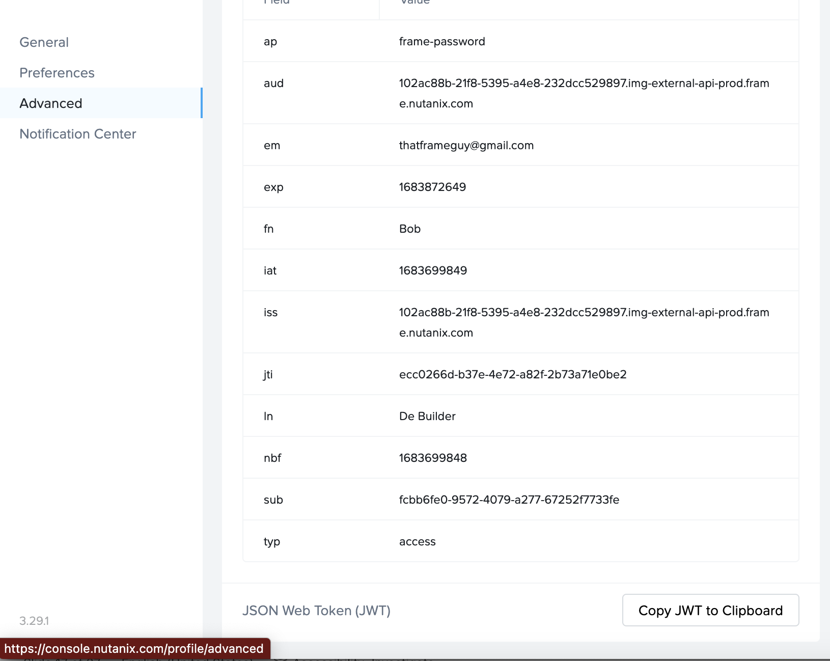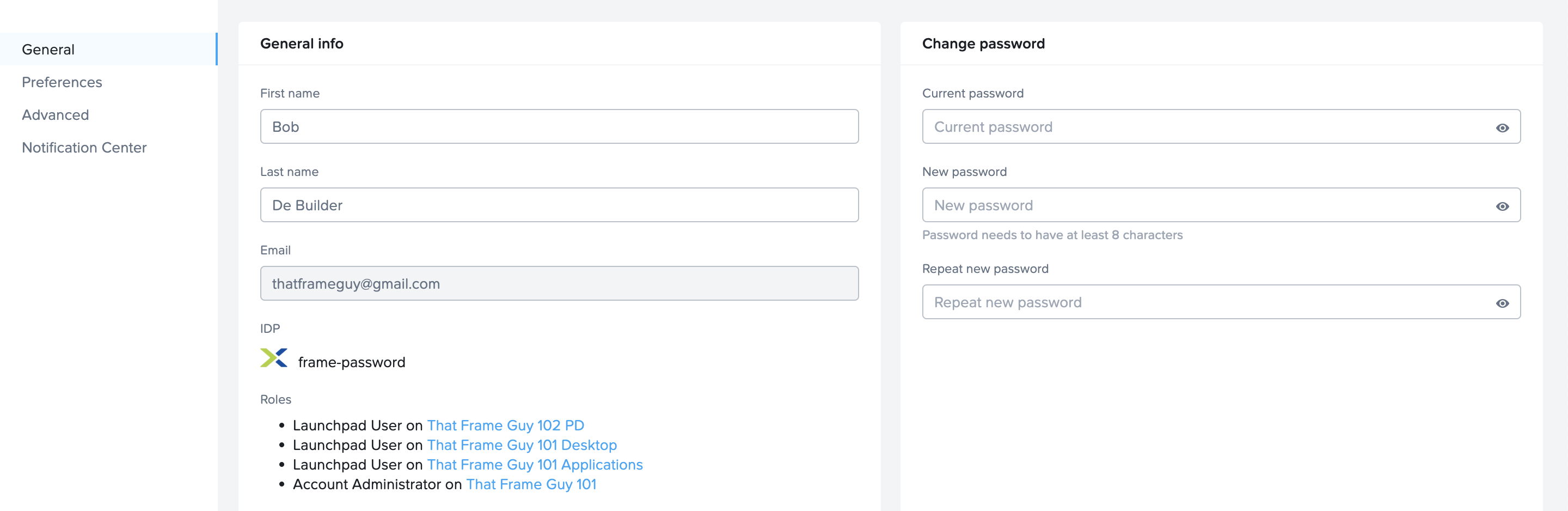 View and edit your account information including name, password, and email. This section displays your Frame account details and lists the Frame environments where you have access.