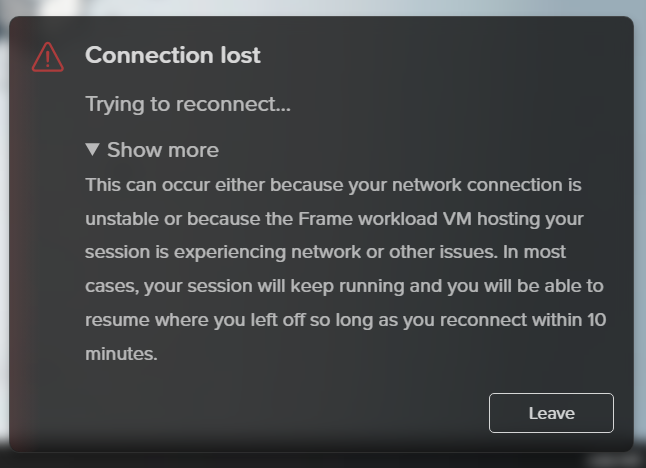 Clicking "Leave" returns you to the Launchpad where a "Resume" button will be available once your connection returns (if the VM is still running). For faster reconnection when network issues resolve, use the "Reconnect" button instead of waiting for automatic attempts.