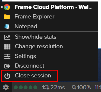 If you notice network performance issues in your Frame sessions, the Frame Support team recommends evaluating a few things before creating a support case. While connected to a session, there are a couple of data points that can help diagnose connection issues: the bandwidth indicator and network latency data.