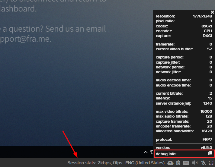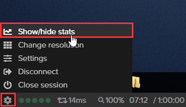 You may also help your IT help desk by providing them with your “Session ID.” Simply click on the gear menu in the bottom left corner of the session and select “Show/hide stats” as shown below:
