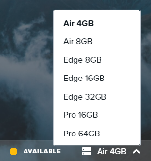 If your administrator has granted you access to more than one system (instance) type, you can switch system types based on the needs of your application. For example, you may normally work on text-based applications like Word and Excel, but occasionally need access to 3D design apps like Autodesk Maya. Text-based applications will do well with an Air 4GB instance type; however, if you need to access to a GPU to run a graphically-intensive app, you can switch to a Pro 16GB system with 4 CPU cores and an NVIDIA GRID GPU.