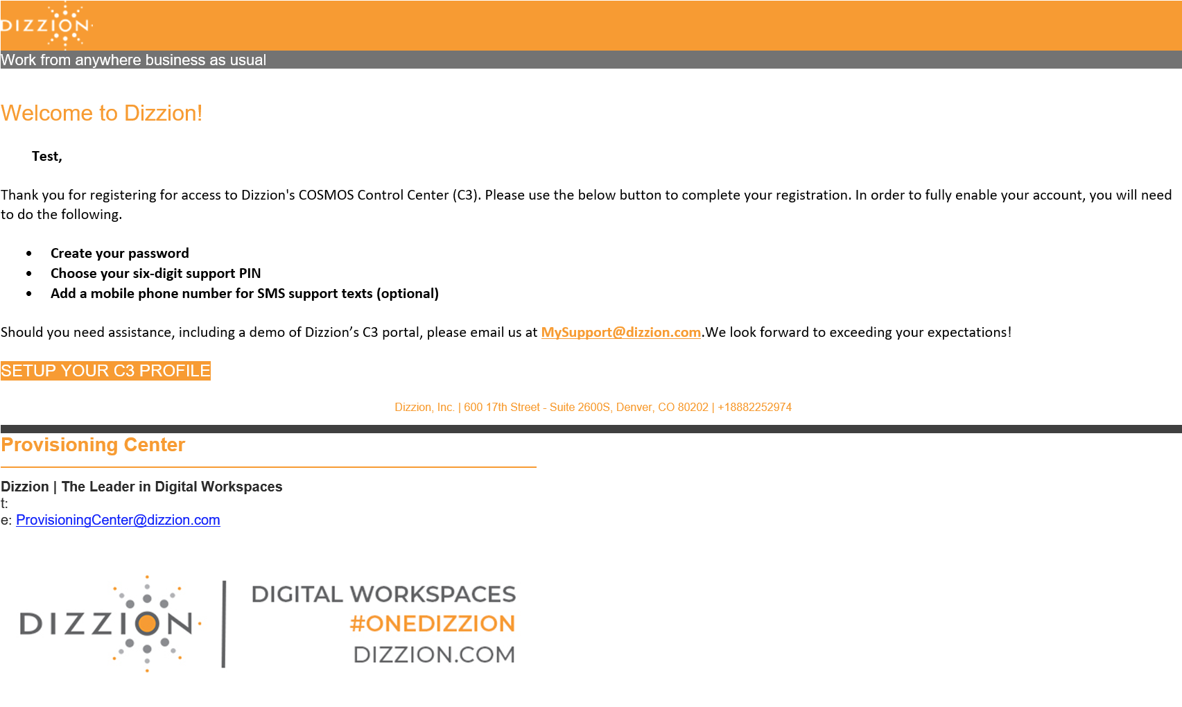 You should receive an email from ProvisioningCenter@dizzion.com as outlined in the support migration announcement. The email will look like this: