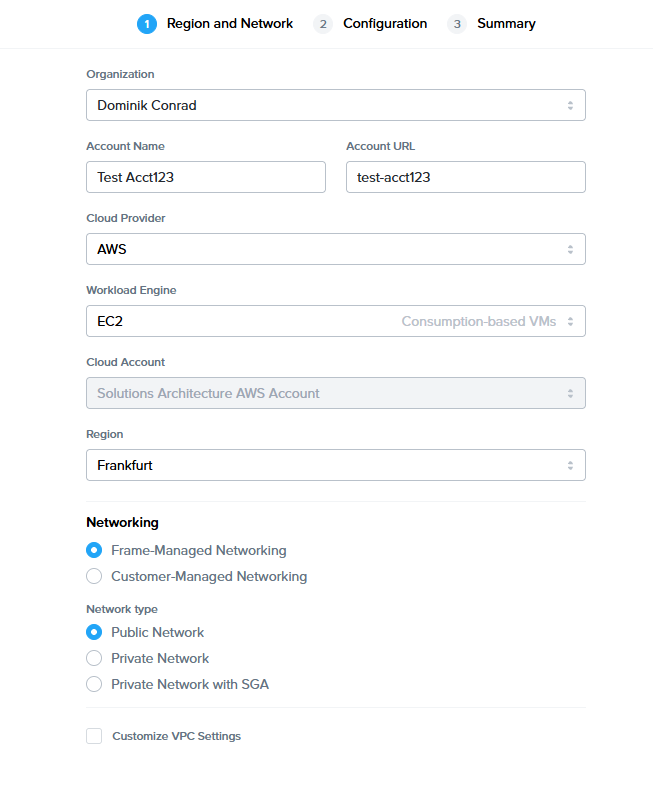 | Customize VPC Settings | Select this checkbox to specify specific CIDRs for the workload VPC If you do not enable this feature and specify a CIDR, Frame will set the workload CIDR to a randomized IP address range of 10.{0-255}.0.0/18 If you plan to connect the workload VPC/VNET to another network through a peer, VPN, or other private connection, you need to specify a non-overlapping CIDR (e.g., 10.0.0.0/20, 192.168.0.0/24).The VPC/VNET CIDR can be changed after the Frame account is created under Dashboard, Settings, Networking, as long as there are no customer-provisioned network resources (e.g., peers, VPNs, gateways, etc.) attached to the Frame-provisioned VPC/VNET. |