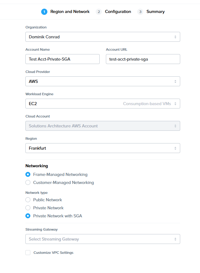 | Use Streaming Gateway | Select this option and specify the existing SGA 4 cluster that will be attached to this Frame account. |