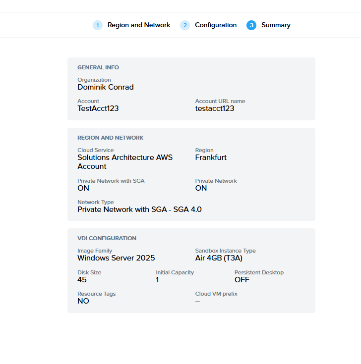 | Region | Specify the desired datacenter or cluster you would like the account to be created in. |