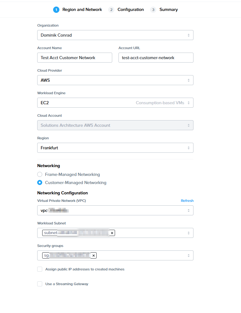 - Customer-Managed Networking: all workload VMs have private IP addresses. The customer is solely responsible for configuring and managing the network containing the Frame account workload VMs, routing between end users and the workload VMs, and creation of the SGA (if required).