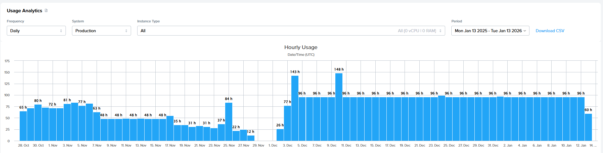 The hourly usage is broken up by system type, with a key for each system type displayed below. Toggle which system types are displayed on the graph by clicking on them or changing the “Pool” from the drop down menu. In the example below, we have disabled the production Air 16GB system type.