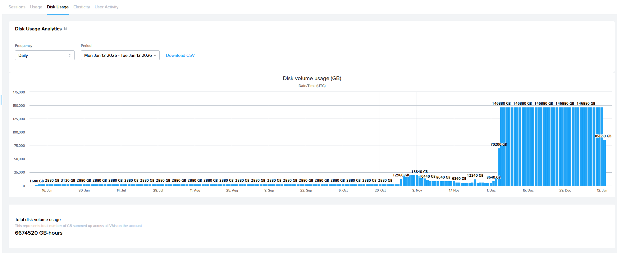 Frame provides a variety of reports to see exact usage and analytics about your tenant. Navigate to the “Analytics” panel in your Dashboard to see detailed information about your users' sessions, usage, disk usage, and elasticity at the account level. Each of these reports can be downloaded using the Download CSV button in the upper right corner of the panel.