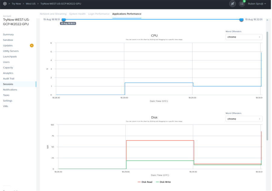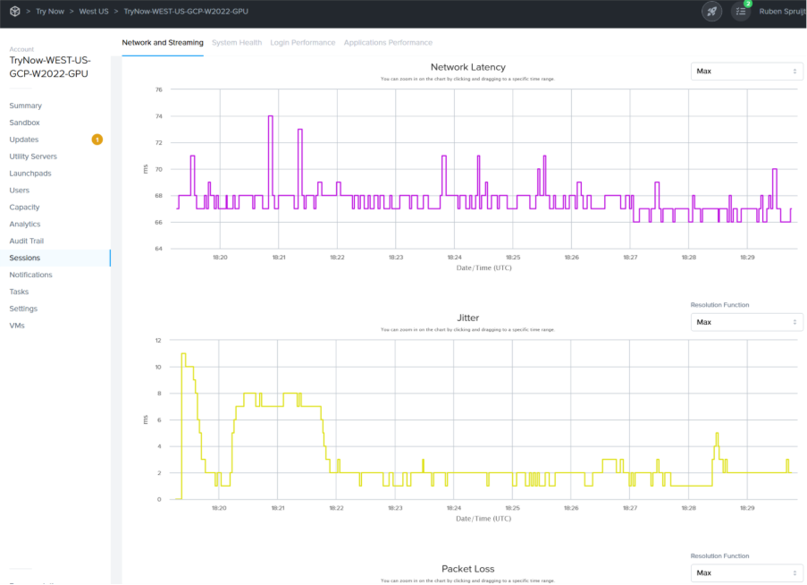 Telemetry data is captured every second, transmitted, and stored for multiple months into Dizzion’s cloud-native backplane, which resides in the US or EU per customer choice. It is governed by controls and audit logs, including customers' ability to opt out of using Dizzion Overwatch. Telemetry includes workload VM system health, Frame Remoting Protocol (FRP) streaming performance, Windows login experience, application performance, and user experience score.