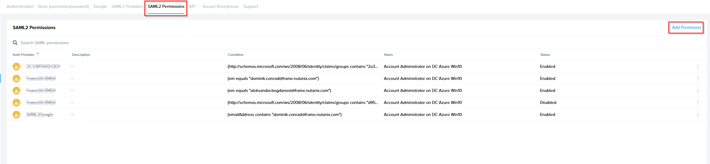 Once the SAML2 Provider is successfully configured in the Nutanix Console, administrators will need to add authorization rules from the SAML2 Permissions tab listed to the right of the SAML2 Provider tab.