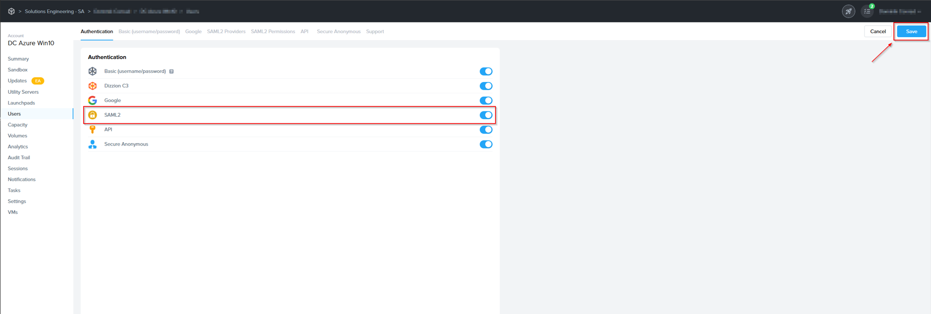 1. Enable the SAML2 toggle under the Authentication tab and click Save.