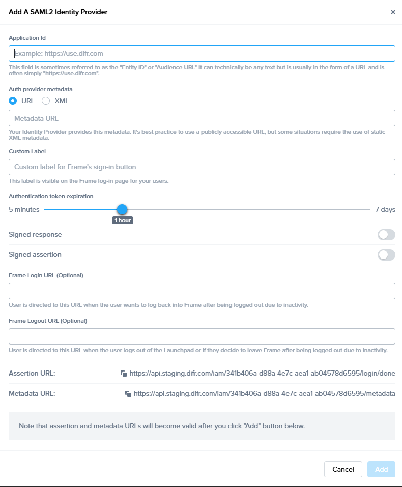 3. Enter the necessary configuration information for your new SAML2 identity provider in Frame.