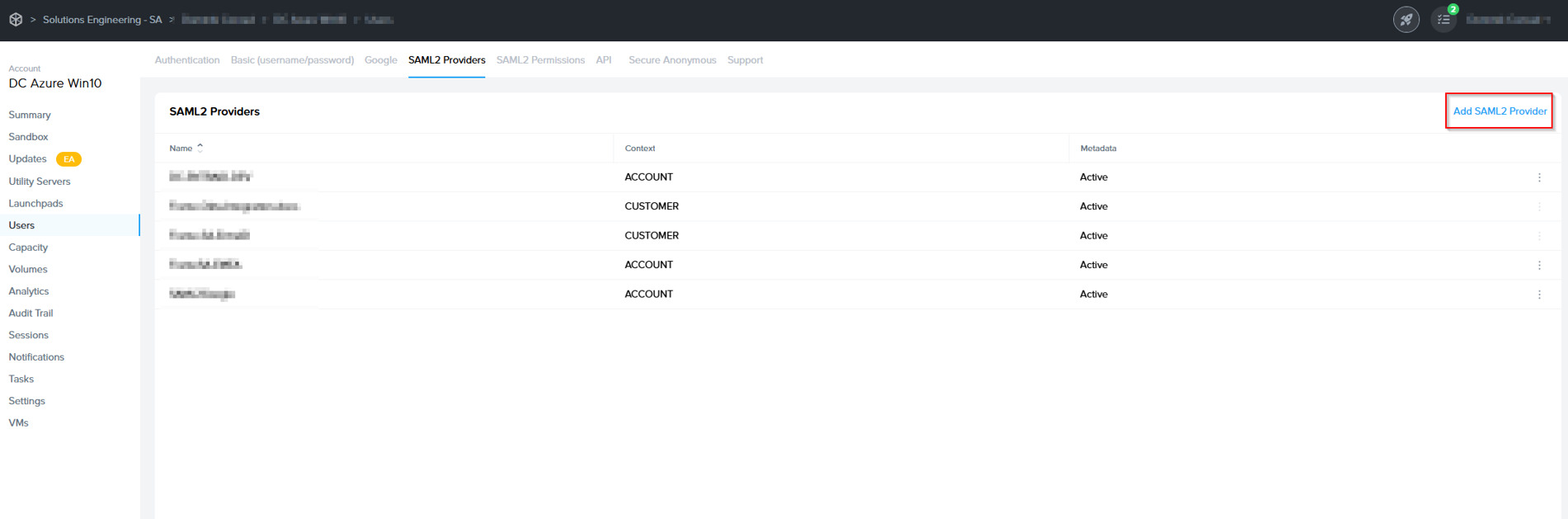 Before a SAML2 identity provider can be added, the administrator must enable SAML2 Providers at a given level by                  navigating to the Admin Console. From there, navigate to the Customer or Organization page (depending on where you      wish to add the IdP). Select Users from the left-hand menu.