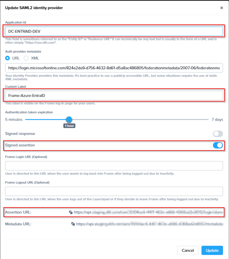 The Redirect URL. This is the Frame destination URL that will process the Entra ID-generated assertions/claims after users authenticate through Entra ID.