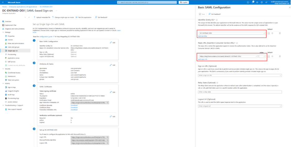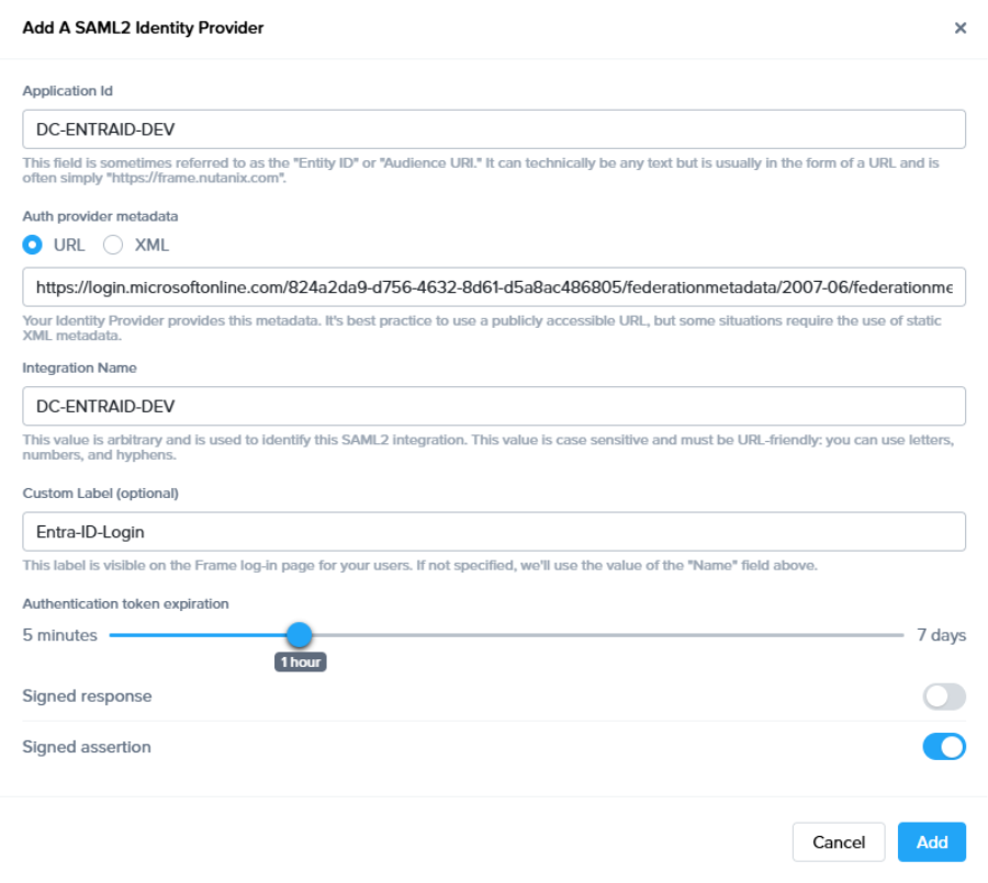 Your SAML2 Integration Name is a case-sensitive, URL-friendly, unique, and descriptive value that represents the integration between your Entra ID and Frame. This value can have only letters, numbers, and the dash symbol; no space or punctuation are allowed.