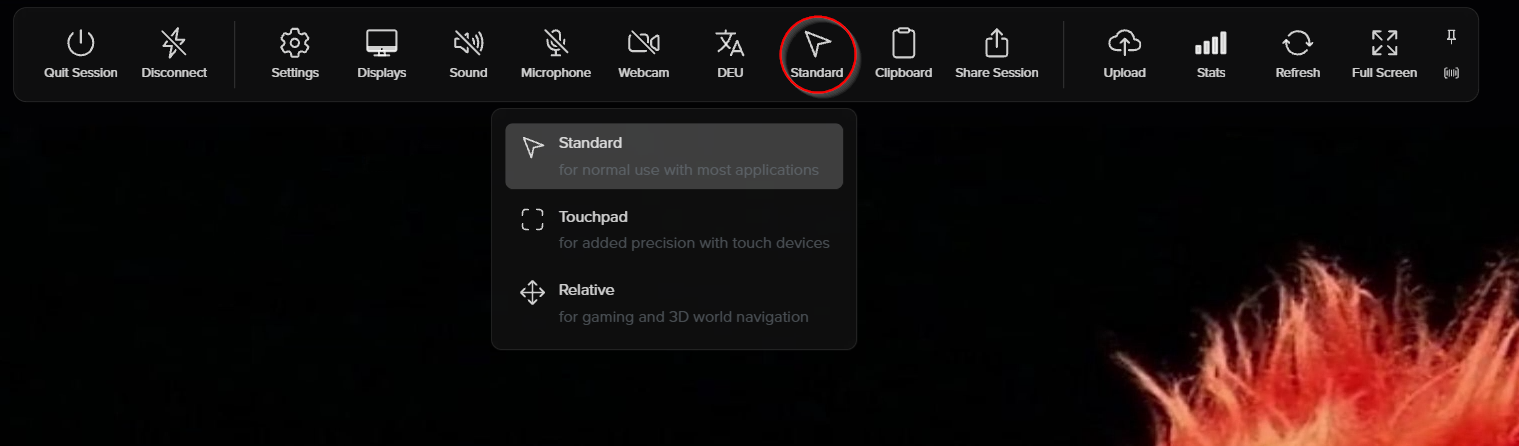 Once enabled, your users can change their mouse mode in the Frame session by clicking on the Mouse Mode icon on the right side of their Frame status bar.