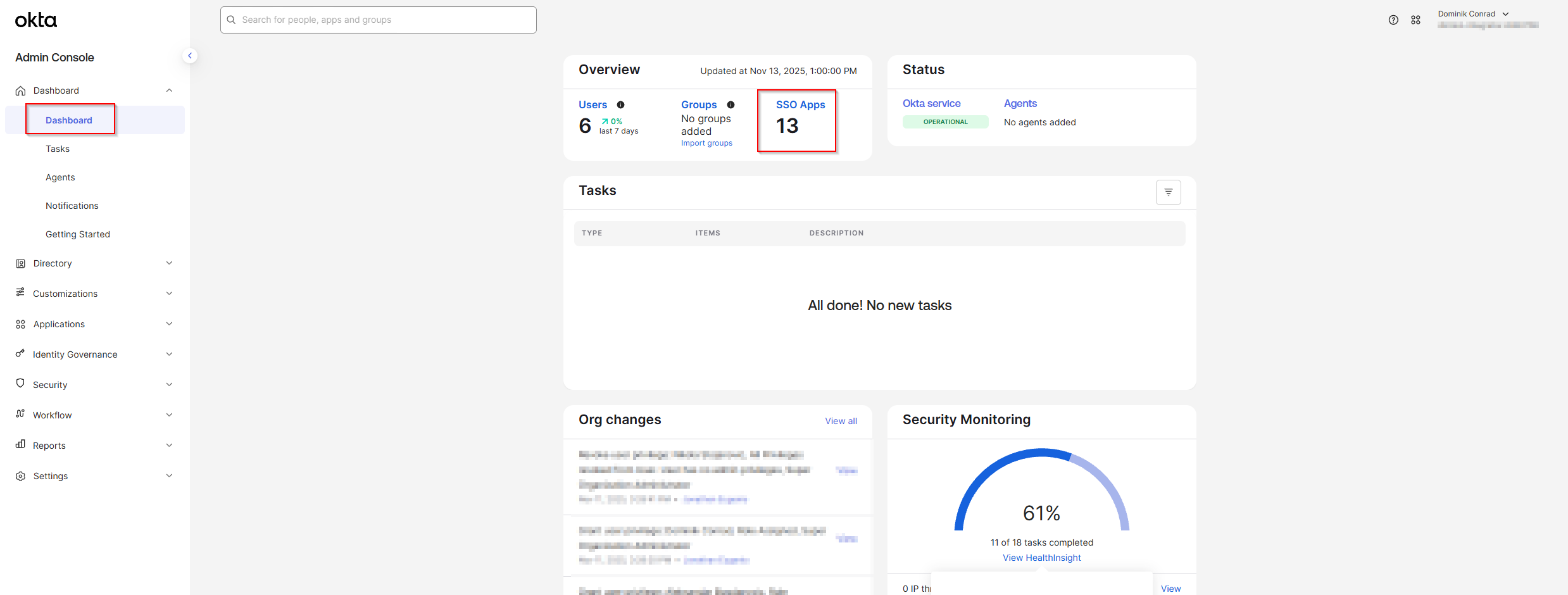 - In a separate/new tab, log in to your Okta account as an Admin and open the Dashboard. Select SSO Apps.
