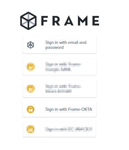 - Your new SAML2 auth integration will appear as button on your Frame login page. The URL for navigating to your Frame login page will vary depending on which level the SAML2 integration was configured. See our section about Entities and URLs to help pick the right one for you and your end-users and/or staff.