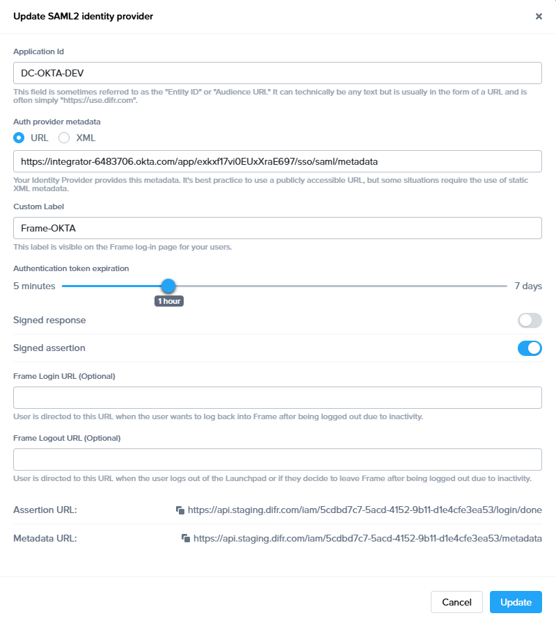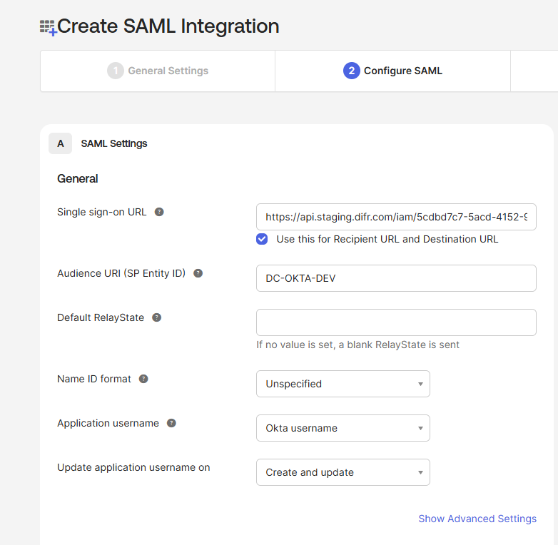 DC-OKTA-DEV. This customer-defined string will be entered on the Frame side as our Application ID later on. You must use a unique Audience URI for your own IdP integration. - Default RelayState: This field can be left blank for SP-initiated SSO scenario. For IdP-initated SSO scenarios, you will need to specify the URL your IdP will redirect the user to once the user has authenticated to Okta. The value can be a custom entity endpoint URL or a Launch Link URL.