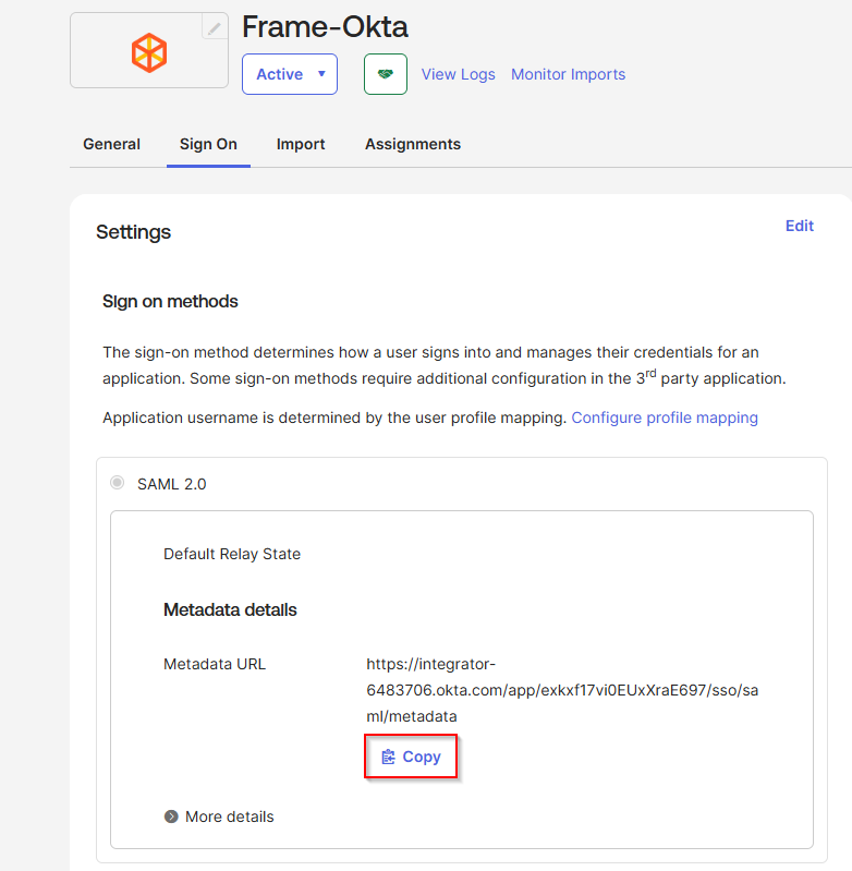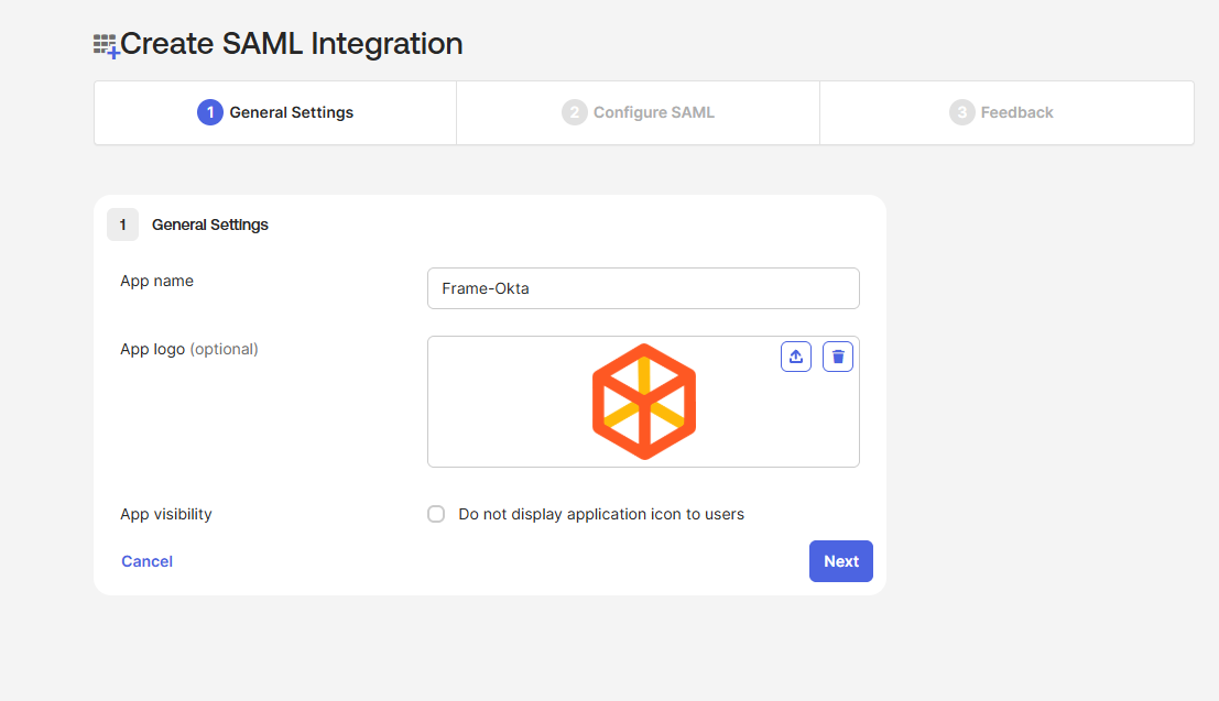 - The Okta side of the setup is now complete. Next, we'll configure the Frame side of the integration using the the values we've copied from these steps in the Okta Dashboard.