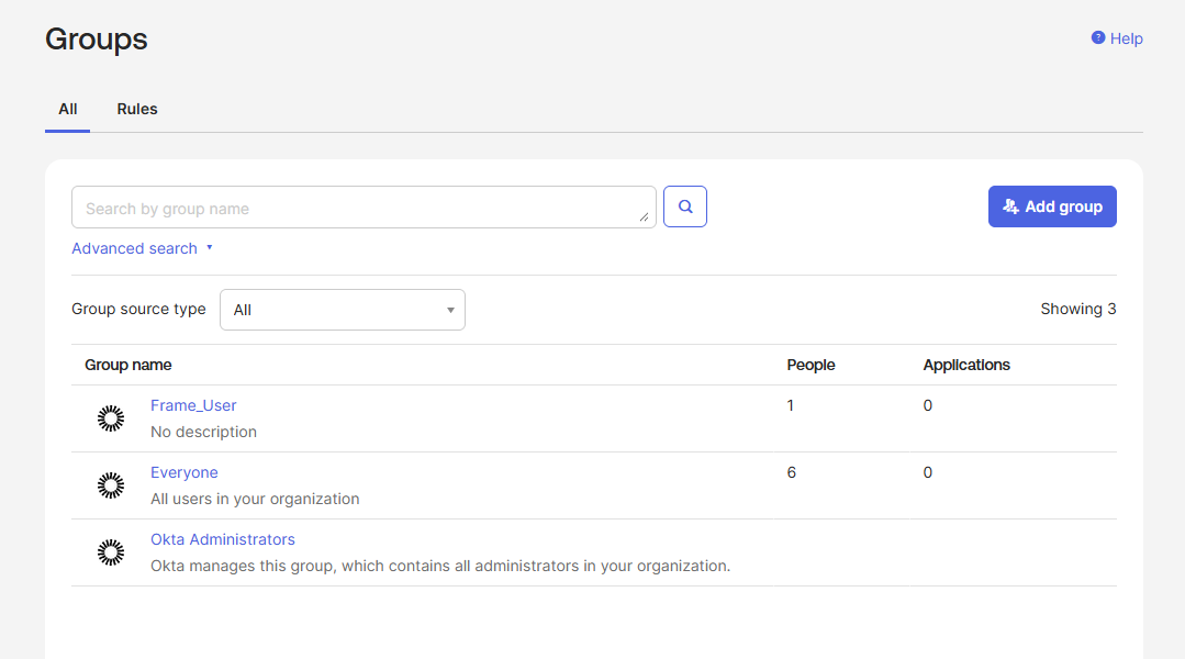 Please be aware that while Okta does have a pre-built Frame app, this app does not yet support group attributes. In order to use group attributes, you must configure the application manually as described below.