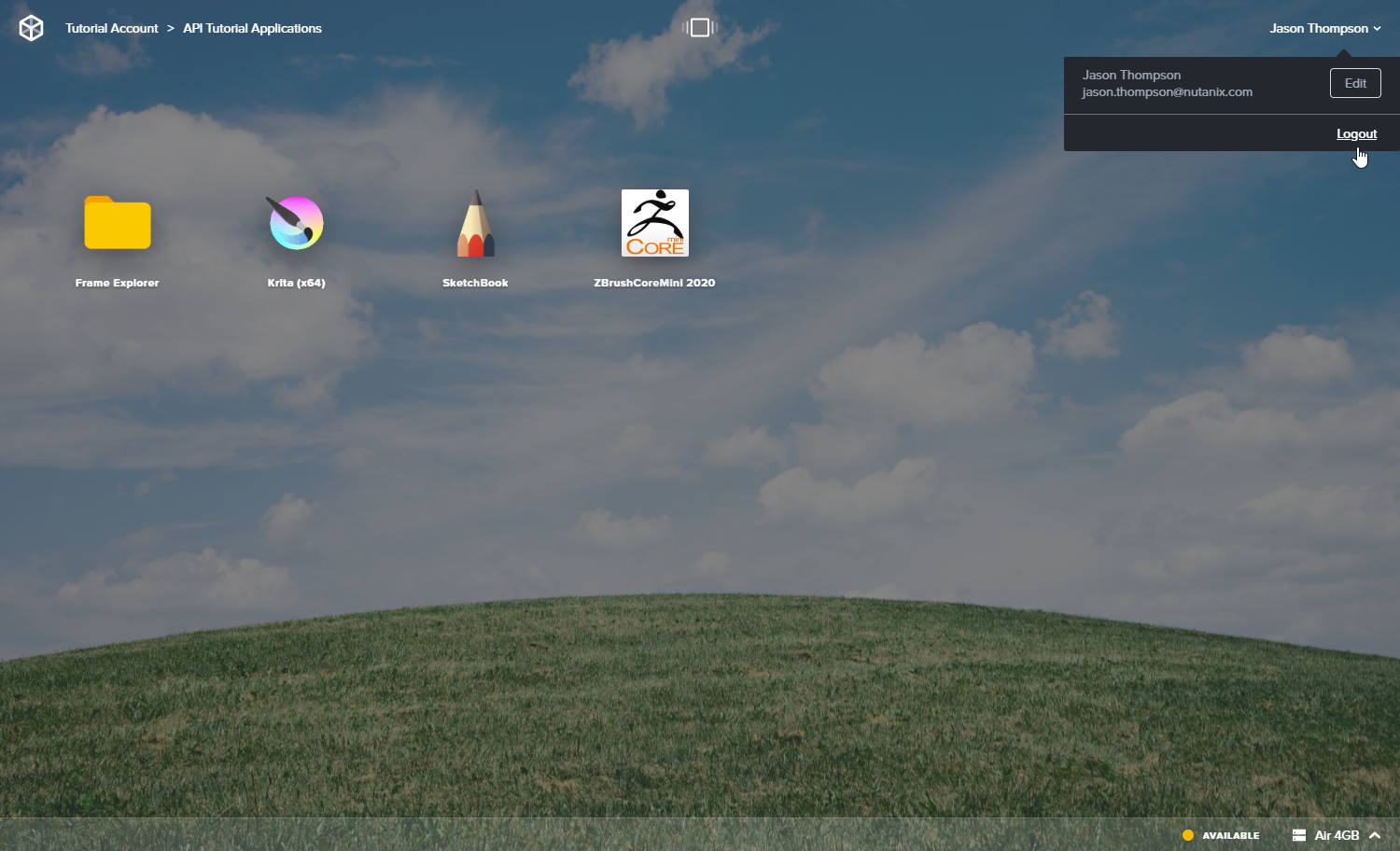 Additionally, when using the Launchpad, the logout URL is tied to the Logout button from the Profile menu at the top-right of the Launchpad. When a user clicks this, Frame invalidates the user's token and redirects the user's browser to the URL specified in the SAT's metadata.