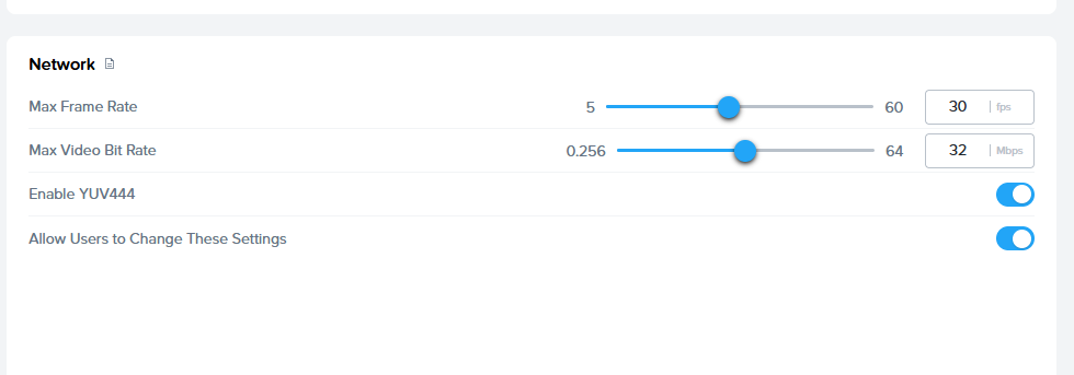 Frame dynamically adjusts bandwidth based on streamed content and network conditions to consume the lowest bandwidth while maintaining the best possible user experience. If you need to set a bandwidth limit for a user connection, administrators can adjust the "Max Bandwidth" slider in session settings.