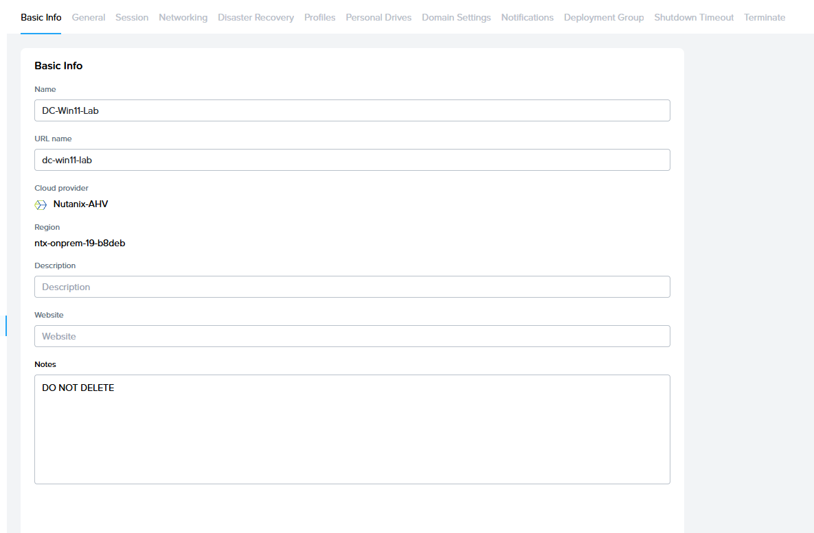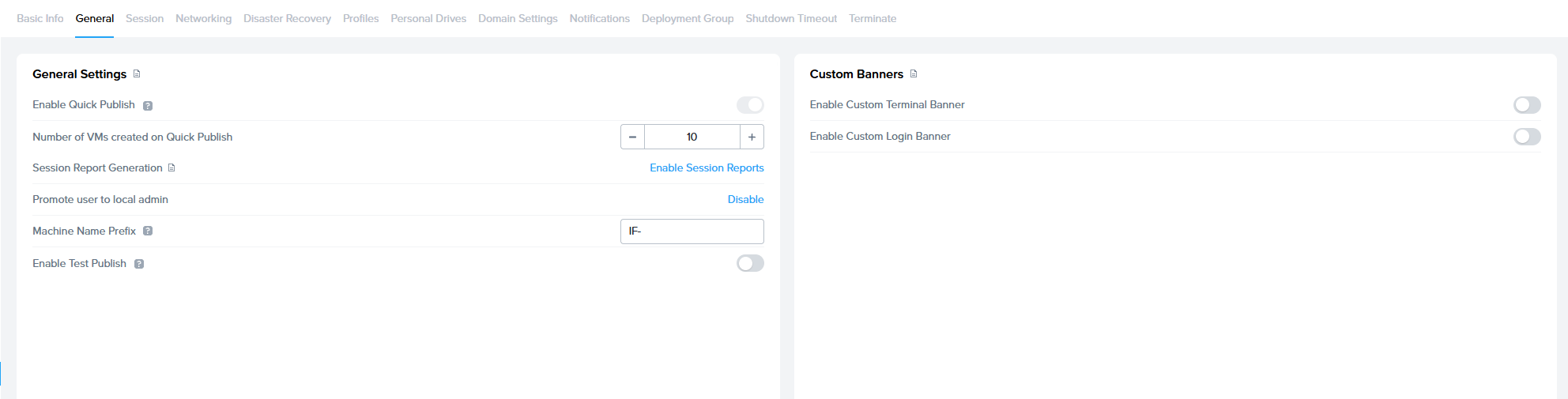 | General | Provides administrators with the ability to enable Quick Publish and/or Test Publish, generate Session Reports, set the machine name prefix for non-domain-joined workload VMs, and enable custom terminal and login banners. |