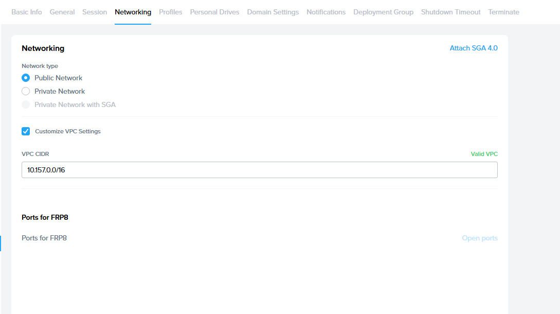 | Network type | For accounts created using Frame-managed networking, this field specifies whether the workload VMs are on a public network, private network, or a private network with one or more Streaming Gateway Appliances. |