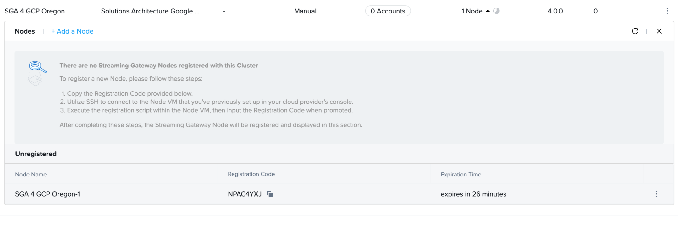 To manually create an SGA Node, go to the Streaming Gateways page and find the Manually Deployed SGA Cluster that will have this new SGA Node. You may need to click on + Add a Node to add a new SGA Node to the SGA Cluster.