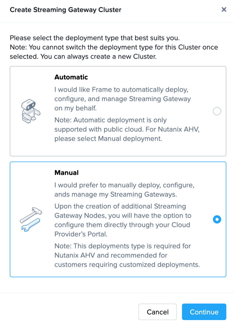 3. Select “Manual” and then click the **Continue** button. 4. Complete the Create Streaming Gateway configuration form.