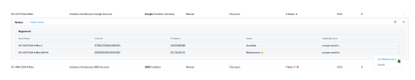 Lastly, Maintenance Mode can be stopped by again clicking on the kebab menu to the right of the desired node and selecting **End Maintenance**.