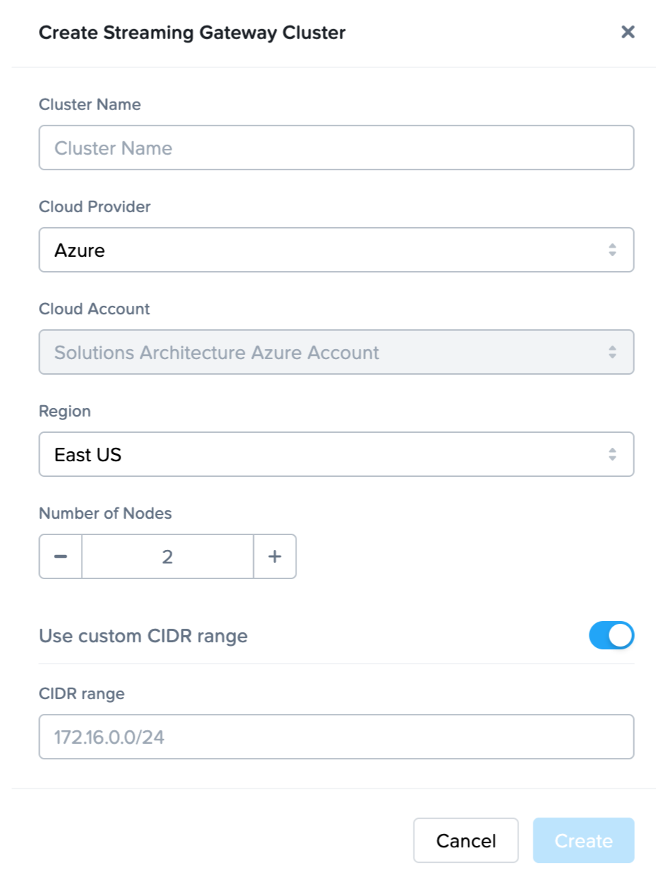 If you are creating an SGA 4 cluster with the expectation of upgrading from existing SGA 3.x Frame accounts, please ensure you use a non-overlapping CIDR for the SGA 4 cluster. To accomplish this, enable the "Use custom CIDR range" slider in the Create Streaming Gateway Cluster configuration form.